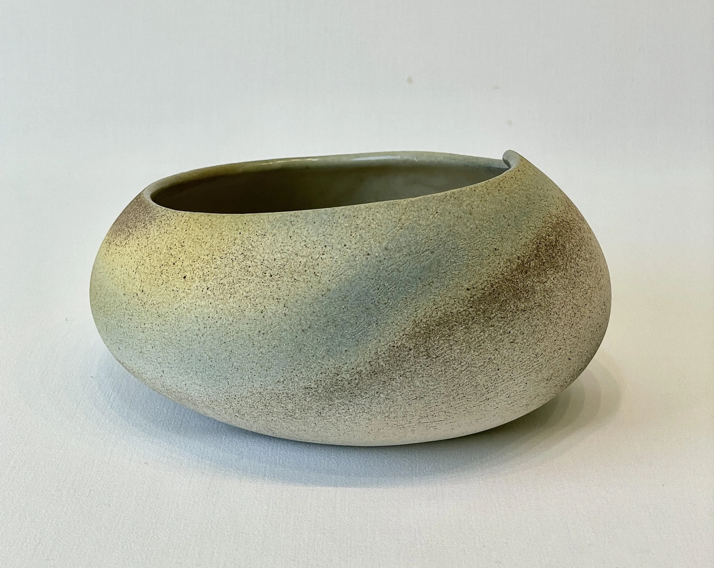 This subtly asymmetric bowl form is enhanced by the swirling lines of colour leading to the rim’s apex.