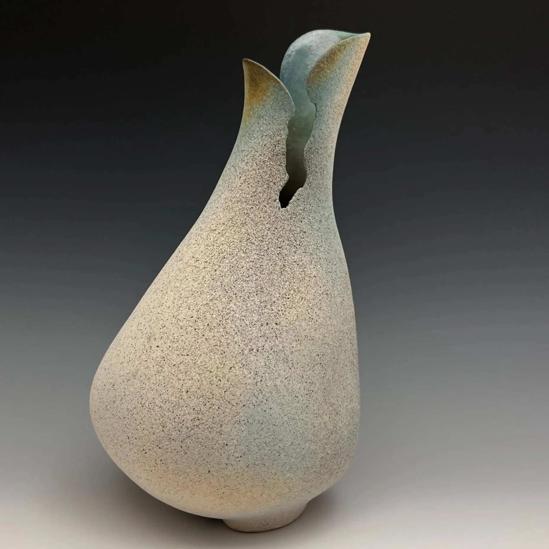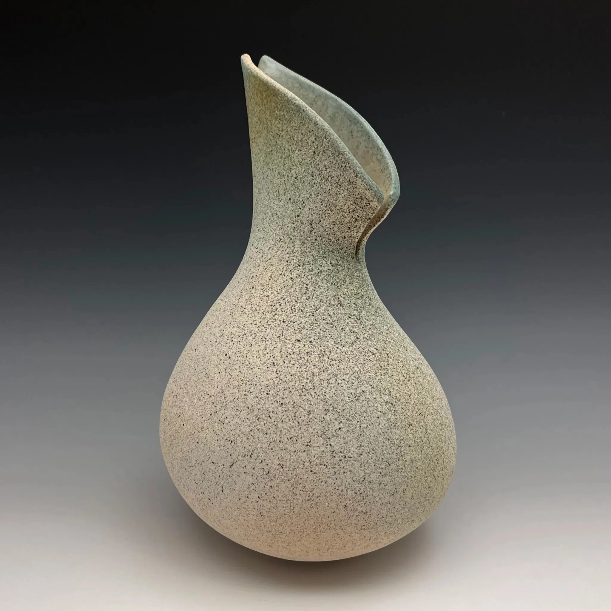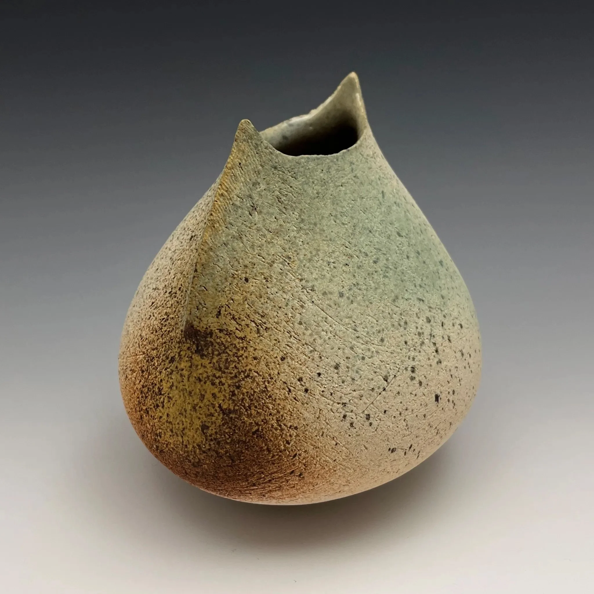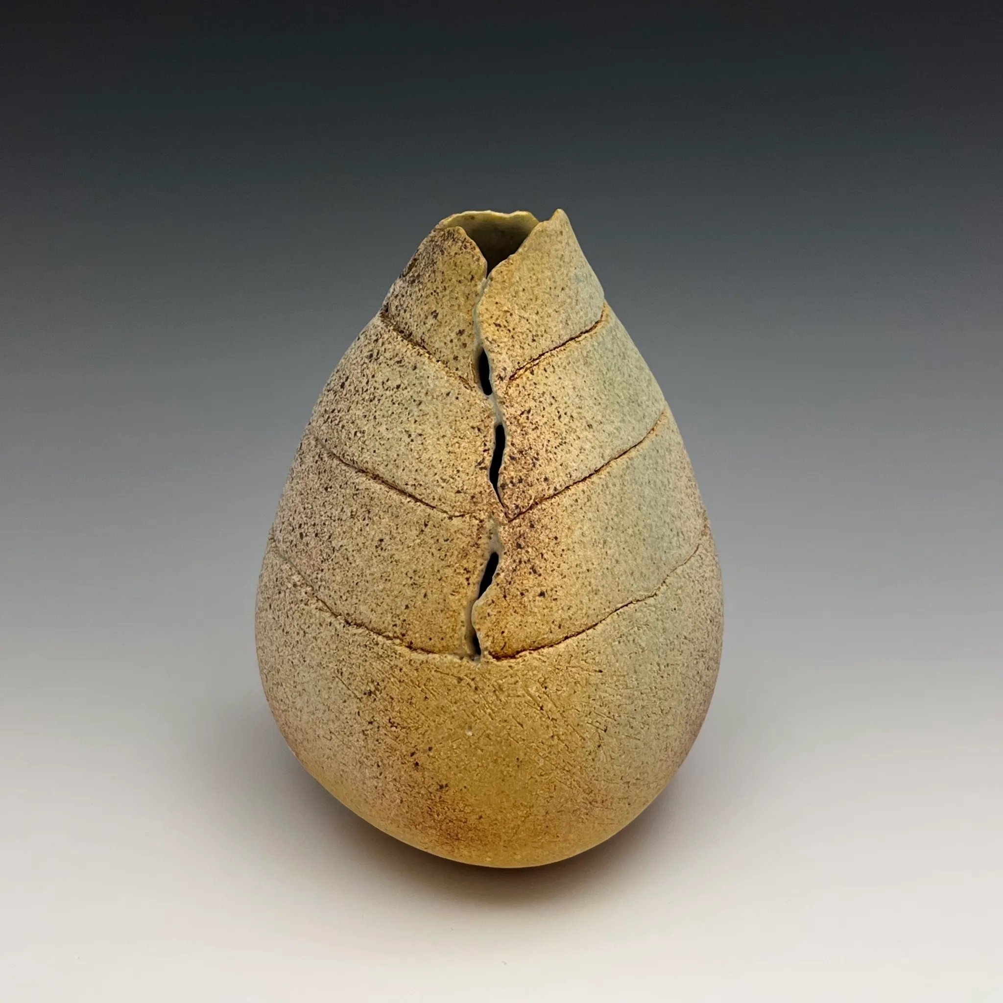 This form captures the delicate lines of waves as they unfold upon sand. With the glaze reminiscent of the sea on a tranquil morning, the gentle opening at the crest mirrors the way the sea retreats into the swirling tide.